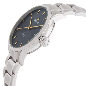Silver-tone stainless steel case and bracelet. Fixed silver-tone stainless steel bezel. Anthracite dial with gold-tone hands and index hour markers. Minute markers around the outer rim. Dial Type: Analog. Date display at the 3 o'clock position. Automatic movement. Scratch resistant sapphire crystal. Pull / push crown. Solid case back. Round case shape, case size: 40 mm. Deployment clasp. Water resistant at 50 meters / 165 feet. Functions: date, hour, minute, second. Airmaster Series. Casual watch style. Watch label: Swiss Made. Titoni Airmaster Automatic Anthracite Dial Men's Watch 83733-S-576Y.