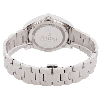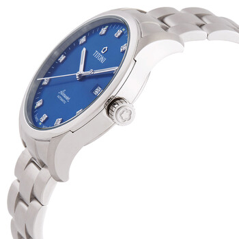Silver-tone stainless steel case and bracelet. Fixed silver-tone stainless steel bezel. Blue dial with silver-tone hands and stone hour markers. Minute markers around the outer rim. Dial Type: Analog. Date display at the 3 o'clock position. Automatic movement. Scratch resistant sapphire crystal. Pull / push crown. Solid case back. Round case shape, case size: 39 mm. Butterfly clasp. Water resistant at 50 meters / 165 feet. Functions: date, hour, minute, second. Airmaster Series. Casual watch style. Watch label: Swiss Made. Titoni Airmaster Automatic Blue Dial Men's Watch 83743-S-656.