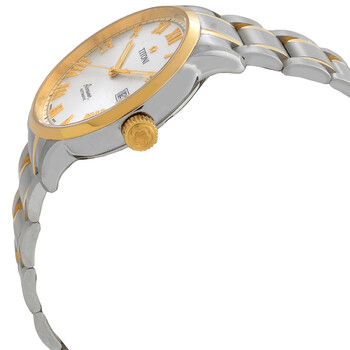 Silver-tone stainless steel case with a two-tone (silver-tone and yellow gold PVD) stainless steel bracelet. Fixed yellow gold PVD stainless steel bezel. Silver dial with gold-tone hands and Roman numeral hour markers. Minute markers around the outer rim. Dial Type: Analog. Date display at the 3 o'clock position. Automatic movement. Scratch resistant sapphire crystal. Pull / push crown. Solid case back. Round case shape, case size: 40 mm. Butterfly clasp. Water resistant at 50 meters / 165 feet. Functions: date, hour, minute, second. Airmaster Series. Casual watch style. Watch label: Swiss Made. Titoni Airmaster Automatic Silver Dial Men's Watch 83733 SY-561.