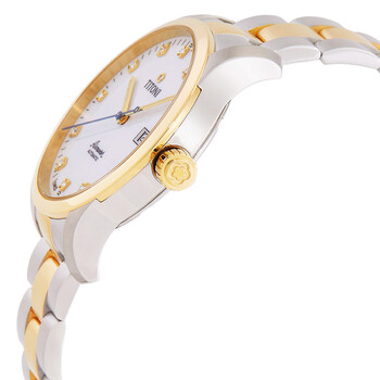 Silver-tone stainless steel case with a two-tone (silver-tone and yellow gold PVD) stainless steel bracelet. Stone yellow gold PVD stainless steel bezel. White dial with gold-tone hands and stone hour markers. Minute markers around the outer rim. Dial Type: Analog. Date display at the 3 o'clock position. Automatic movement. Scratch resistant sapphire crystal. Pull / push crown. Solid case back. Round case shape, case size: 39 mm. Butterfly clasp. Water resistant at 50 meters / 165 feet. Functions: date, hour, minute, second. Airmaster Series. Casual watch style. Watch label: Swiss Made. Titoni Airmaster Automatic White Dial Men's Watch 83743 SY-582.