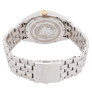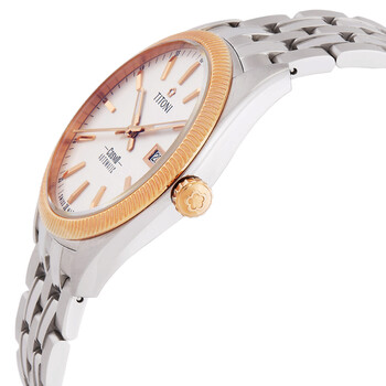 Silver-tone stainless steel case and bracelet. Fixed rose gold PVD stainless steel bezel. Silver dial with rose gold-tone hands and index hour markers. Minute markers around the outer rim. Dial Type: Analog. Date display at the 3 o'clock position. Automatic movement. Scratch resistant sapphire crystal. Pull / push crown. Solid case back. Round case shape, case size: 41 mm. Butterfly clasp. Water resistant at 100 meters / 330 feet. Functions: date, hour, minute, second. Cosmo Series. Casual watch style. Watch label: Swiss Made. Titoni Cosmo Automatic Silver Dial Men's Watch 878 SRG-606.