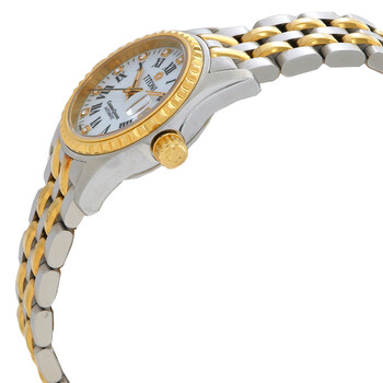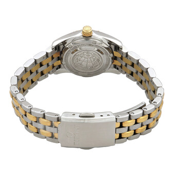 Silver-tone stainless steel case with a two-tone (silver-tone and yellow gold PVD) stainless steel bracelet. Fixed yellow gold PVD stainless steel bezel. White dial with gold-tone hands and Roman numeral-stone hour markers. Minute markers around the outer rim. Dial Type: Analog. Date display at the 3 o'clock position. Automatic movement. Scratch resistant sapphire crystal. Pull / push crown. Solid case back. Round case shape, case size: 27 mm. Butterfly clasp. Water resistant at 100 meters / 330 feet. Functions: date, hour, minute, second. Cosmo Series. Watch label: Swiss Made. Titoni Cosmo Automatic White Dial Ladies Watch 729 SY-019.