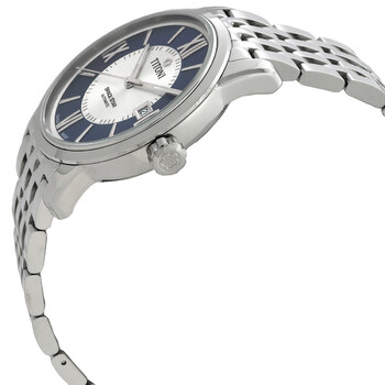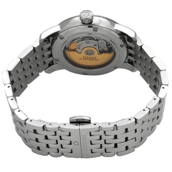 Silver-tone stainless steel case and bracelet. Fixed silver-tone stainless steel bezel. Silver/navy blue dial with silver-tone hands and index-Roman numeral hour markers. Minute markers around the inner ring. Dial Type: Analog. Date display at the 3 o'clock position. Automatic movement. Scratch resistant sapphire crystal. Pull / push crown. Transparent see through case back. Round case shape, case size: 28 mm. Butterfly clasp. Water resistant at 50 meters / 165 feet. Functions: date, hour, minute, second. Space Star Series. Casual watch style. Watch label: Swiss Made. Titoni Space Star Automatic Ladies Watch 23538 S-580.