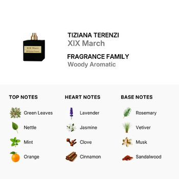 Discover the exquisite scent of Tiziana Terenzi's XIX March. This men's fragrance, launched in 2012, is a captivating blend of aromatic and spicy notes, making it a perfect choice for the sophisticated man. The fragrance is an Extrait De Parfum, a concentrated form of fragrance, which ensures long-lasting wear and a more intense scent experience.