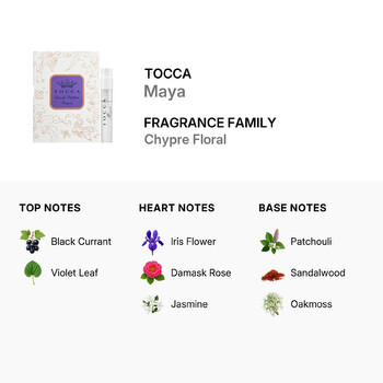 The Tocca Ladies Maya EDP opens with vibrant top notes of black currant and violet leaf. These are followed by heart notes of iris flower, Damask rose, and jasmine that make the scent even more enchanting. The base notes of patchouli, sandalwood, and oakmoss provide a warm and earthy finish, leaving a long-lasting and pleasant aroma. This unique combination of notes makes this fragrance a truly special addition to any perfume collection.