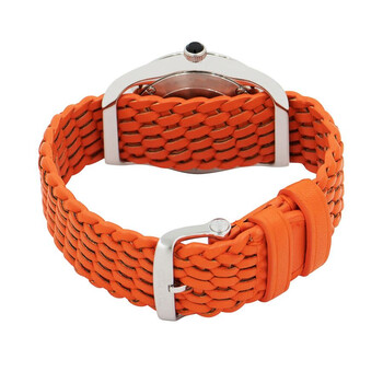 Silver-tone stainless steel case with a orange leather strap. Fixed silver-tone stainless steel bezel. White dial with blue hands and Arabic numeral hour markers. Minute markers around the outer rim. Dial Type: Analog. Quartz movement. Scratch resistant sapphire crystal. Solid case back. Round case shape, case size: 34 mm, case thickness: 9 mm. Band width: 19 mm. Buckle clasp. Functions: hour, minute. 002 Series. Casual watch style. Watch label: Swiss Made. Tom Ford 002 Quartz White Dial Ladies Watch TF0120146437 ORA.