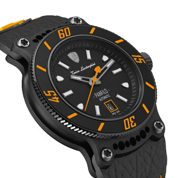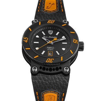 Black titanium case with a black leather strap. Fixed black titanium bezel. Black dial with black hands and index hour markers. Minute markers around the outer rim. Dial Type: Analog. Luminescent hands and markers. Date display at the 6 o'clock position. Sellita caliber SW200-1 automatic movement, containing 26 Jewels, bitting at 28800 vph, and has a power reserve of approximately 38 hours. Scratch resistant sapphire crystal. Solid case back. Round case shape. Case size: 44 mm. Case thickness: 18 mm. Strap width: 20 mm. Fold over clasp. Water resistant at 100 meters / 330 feet. Functions: date, hour, minute, second. Panfilo Series. Casual watch style. Watch label: Swiss Made. Tonino Lamborghini Panfilo Automatic Black Dial Men's Watch TLF-T03-3.