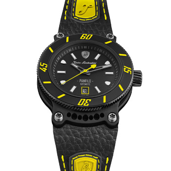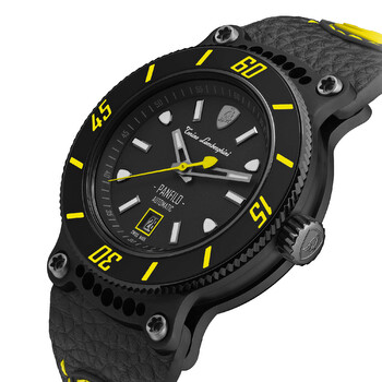 Black titanium case with a black leather strap. Fixed black titanium bezel with an inlaid black ring. Black dial with luminous grey hands and index hour markers. Arabic numeral minute markers (at 5 minute intervals). Minute markers around the outer rim. Dial Type: Analog. Luminescent hands and markers. Date display at the 6 o'clock position. Sellita caliber SW200-1 automatic movement, containing 26 Jewels, bitting at 28800 vph, and has a power reserve of approximately 38 hours. Scratch resistant sapphire crystal. Screw down crown. Solid case back. Round case shape. Case size: 44 mm. Case thickness: 15 mm. Band width: 29.6 mm. Fold over clasp. Water resistant at 100 meters / 330 feet. Functions: date, hour, minute, second. Panfilo Series. Casual watch style. Watch label: Swiss Made. Tonino Lamborghini Panfilo Automatic Black Dial Men's Watch TLF-T03-5.