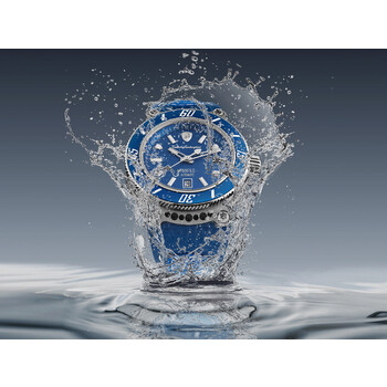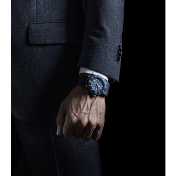 Grey titanium case with a blue leather strap. Fixed blue titanium bezel. Blue dial with silver-tone hands and index hour markers. Minute markers around the outer rim. Dial Type: Analog. Luminescent hands and markers. Date display at the 6 o'clock position. Sellita Caliber SW200-1 Automatic movement, containing 26 Jewels, bitting at 28800 vph, and has a power reserve of approximately 38 hours. Scratch resistant sapphire crystal. Solid case back. Round case shape, case size: 44 mm. Fold over clasp. Water resistant at 100 meters / 330 feet. Functions: date, hour, minute, second. Panfilo Series. Casual watch style. Watch label: Swiss Made. Tonino Lamborghini Panfilo Automatic Blue Dial Men's Watch TLF-T03-2.