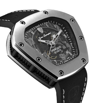 Grey titanium case with a black rubber strap. Fixed grey titanium bezel. Grey (skeleton center) dial with luminous silver-tone hands and Arabic numeral hour markers. Minute markers around the outer rim. Dial Type: Analog. Luminescent hands and markers. Sellita caliber SW200-1 Automatic movement, containing 26 Jewels, bitting at 28800 vph, and has a power reserve of approximately 38 hours. Scratch resistant sapphire crystal. Transparent case back. Asymmetrical case shape. Case dimensions: 51.5 mm x 46 mm. Case thickness: 12 mm. Band width: 22 mm. Fold over clasp. Water resistant at 100 meters / 330 feet. Functions: hour, minute, second. Spyder Series. Casual watch style. Watch label: Swiss Made. Tonino Lamborghini Spyder Automatic Men's Watch TLF-T06-1.