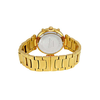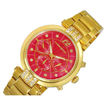 Torino Carrero Ladies Adelina, Swiss ISA 9238 Multi-function,Genuine Sapphire Setting,Mother of Pearl Red dial, Goldtone. Yellow gold-tone stainless steel case and bracelet. Fixed yellow gold-tone stainless steel bezel. Red dial with yellow gold-tone hands and Roman numeral & index hour markers. Minute markers around the outer rim. Dial Type: Analog. Luminescent hands and markers. Day scale display at the 9 o'clock position. Three sub-dials displaying: date, day and 24 hour. ISA Caliber 9238 quartz movement. Scratch resistant mineral crystal. Pull / push crown. Solid case back. Round case shape, case size: 38 mm, case thickness: 11.25 mm. Band width: 19.5 mm, band length: 7 inches. Deployment with push button release clasp. Water resistant at 100 meters / 330 feet. Functions: date, day, GMT, second time zone, hour, minute, second. Adelina Series. Casual watch style. Watch label: Swiss Quartz Multi- function Movement. Torino Carrero Adelina GMT Quartz Red Dial Ladies Watch CL1G03RDJ.