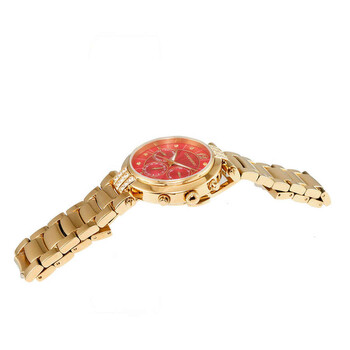 Torino Carrero Ladies Adelina, Swiss ISA 9238 Multi-function,Genuine Sapphire Setting,Mother of Pearl Red dial, Rose tone. Rose gold-tone stainless steel case and bracelet. Fixed rose gold-tone stainless steel bezel. Red dial with rose gold-tone hands and Roman numeral & index hour markers. Minute markers around the outer rim. Dial Type: Analog. Luminescent hands and markers. Day scale display at the 9 o'clock position. Three sub-dials displaying: date, day and 24 hour. ISA Caliber 9238 quartz movement. Scratch resistant mineral crystal. Pull / push crown. Solid case back. Round case shape, case size: 38 mm, case thickness: 11.25 mm. Band width: 19.5 mm, band length: 7 inches. Deployment with push button release clasp. Water resistant at 100 meters / 330 feet. Functions: date, day, GMT, second time zone, hour, minute, second. Adelina Series. Casual watch style. Watch label: Swiss Quartz Multi- function Movement. Torino Carrero Adelina GMT Quartz Red Dial Ladies Watch CL1R03RDJ.