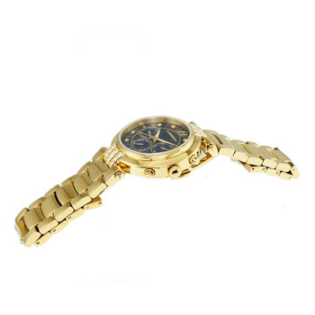 Ladies all stainless steel, Swiss parts multi function Ronda movement, Genuine white sapphires stones GOLD tone BLUE MOP dial Yellow gold-tone stainless steel case and bracelet. Fixed yellow gold-tone stainless steel bezel. Blue dial with yellow gold-tone hands and index hour markers. Minute scale around the inner rim. Dial Type: Analog. Luminescent hands. Day / date. Three sub-dials displaying: date, day and 24 hour. ISA Caliber 9238 quartz movement. Scratch resistant mineral crystal. Pull / push crown. Solid case back. Round case shape, case size: 38.0 mm, case thickness: 11.25 mm. Band width: 19.5 mm, band length: 7.0 inches. Fold over with double push button release clasp. Water resistant at 30 meters / 100 feet. Functions: date, day, hour, minute, second. Adelina Series. Casual watch style. Watch label: Swiss Movement. Torino Carrero Adelina Quartz Blue Dial Ladies Watch CL1G03BU.