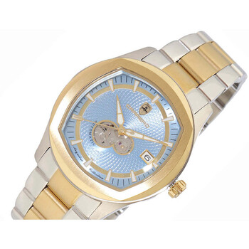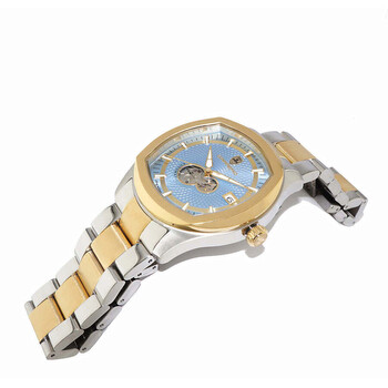 Silver-tone stainless steel case with a two-tone (silver-tone and yellow gold-tone) stainless steel bracelet. Fixed yellow gold-tone stainless steel bezel. Blue dial with yellow gold-tone hands and index hour markers. Minute scale around the inner rim. Dial Type: Analog. Luminescent hands and markers. Date display at the 3 o'clock position. SII Caliber NH35A Automatic movement, containing 24 Jewels, bitting at 21600 vph, and has a power reserve of approximately 41 hours. Scratch resistant mineral crystal. Pull / push crown. Transparent case back. Round case shape, case size: 42 mm, case thickness: 12.25 mm. Band width: 22 mm, band length: 7.5 inches. Deployment with push button release clasp. Water resistant at 50 meters / 165 feet. Functions: date, hour, minute, second. Additional Info: sunray dial with heart beat - 24 jewel automatic. Aequilux Series. Casual watch style. Watch label: Japan Movt. Torino Carrero Aequilux Automatic Blue Dial Men's Watch CTT1875-LBU.