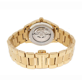 Yellow gold-tone stainless steel case and bracelet. Fixed yellow gold-tone stainless steel bezel. White dial with yellow gold-tone hands and index hour markers. Minute scale around the inner rim. Dial Type: Analog. Luminescent hands and markers. Date display at the 3 o'clock position. SII Caliber NH35A Automatic movement, containing 24 Jewels, bitting at 21600 vph, and has a power reserve of approximately 41 hours. Scratch resistant mineral crystal. Pull / push crown. Transparent case back. Round case shape, case size: 42 mm, case thickness: 12.25 mm. Band width: 22 mm, band length: 7.5 inches. Deployment with push button release clasp. Water resistant at 50 meters / 165 feet. Functions: date, hour, minute, second. Additional Info: sunray dial with heart beat - 24 jewel automatic. Aequilux Series. Casual watch style. Watch label: Japan Movt. Torino Carrero Aequilux Automatic White Dial Men's Watch C1G1875-WT.