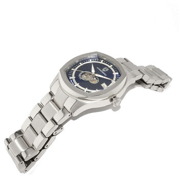 Silver-tone stainless steel case and bracelet. Fixed silver-tone stainless steel bezel. Blue dial with silver-tone hands and index hour markers. Minute scale around the inner rim. Dial Type: Analog. Luminescent hands and markers. Date display at the 3 o'clock position. SII Caliber NH35A Automatic movement, containing 24 Jewels, bitting at 21600 vph, and has a power reserve of approximately 41 hours. Scratch resistant mineral crystal. Pull / push crown. Transparent case back. Round case shape, case size: 42 mm, case thickness: 12.25 mm. Band width: 22 mm, band length: 7.5 inches. Deployment with push button release clasp. Water resistant at 50 meters / 165 feet. Functions: date, hour, minute, second. Additional Info: sunray dial with heart beat - 24 jewel automatic. Aequilux Series. Casual watch style. Watch label: Japan Movt. Torino Carrero Aequilux Blue Dial Men's Watch C1S1875-BU.