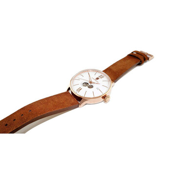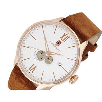 TORINO CARRERO MEN'S WATCH, NH35 (24-JEWELS AUTOMATIC) WITH EXHIBITION BACK, OPEN HEART BEAT CURVE WHITE DIAL, STAINLESS STEEL CASE ROSE TONE, BROWN GENUINE LEATHER BAND Rose gold-tone stainless steel case with a brown genuine leather strap. Fixed rose gold-tone stainless steel bezel. White dial with rose gold-tone hands and Roman numeral & index hour markers. Minute markers around the outer rim. Dial Type: Analog. Luminescent hands. Date display at the 3 o'clock position. TMI Caliber NH35 Automatic movement, containing 24 Jewels, bitting at 21600 vph, and has a power reserve of approximately 41 hours. Scratch resistant mineral crystal. Pull / push crown. Transparent case back. Round case shape, case size: 45 mm, case thickness: 15.25 mm. Band width: 22 mm, band length: 7.5 inches. Buckle clasp. Water resistant at 100 meters / 330 feet. Functions: date, hour, minute, second. Additional Info: open heart. Aerodrome Series. Dress watch style. Watch label: Japan Movt. Torino Carrero Aerodrome Automatic White Dial Men's Watch C1R1780-WTJ.