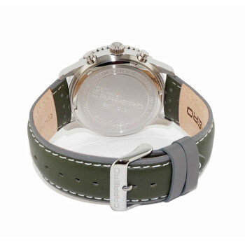 Silver-tone stainless steel case with a green genuine leather strap. Fixed silver-tone stainless steel bezel. Brown dial with silver-tone hands and Arabic numeral & index hour markers. Minute markers around the outer rim. Dial Type: Analog. Luminescent hands. Date display between 4 and 5 o'clock position. Chronograph - sub-dials displaying: 24 hour. Epson VR32 quartz movement. Scratch resistant mineral crystal. Pull / push crown. Solid case back. Round case shape, case size: 46 mm, case thickness: 12.75 mm. Band width: 24 mm, band length: 7.25 inches. Buckle clasp. Water resistant at 100 meters / 330 feet. Functions: chronograph, date, hour, minute, second. Additional Info: mother of pearl dial. Aureum Series. Casual watch style. Watch label: Chronograph, Japan Mov't. Torino Carrero Aureum Chronograph Quartz Brown Dial Men's Watch C1S7023-BN.