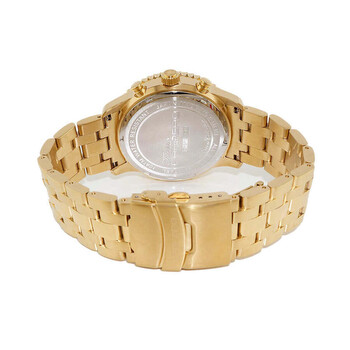Yellow gold-tone stainless steel case and bracelet. Fixed yellow gold-tone stainless steel bezel. Green dial with yellow gold-tone hands and Arabic numeral & index hour markers. Minute markers around the outer rim. Dial Type: Analog. Luminescent hands. Date display between 4 and 5 o'clock position. Chronograph - sub-dials displaying: 24 hour. Epson VR32 quartz movement. Scratch resistant mineral crystal. Pull / push crown. Solid case back. Round case shape, case size: 46 mm, case thickness: 12.75 mm. Band width: 24 mm, band length: 7.25 inches. Fold over with double push button release clasp. Water resistant at 100 meters / 330 feet. Functions: chronograph, date, hour, minute, second. Additional Info: mother of pearl dial. Aureum-mb Series. Casual watch style. Watch label: Chronograph, Japan Mov't. Torino Carrero Aureum-Mb Chronograph Quartz Green Dial Men's Watch C1G7022-GN.