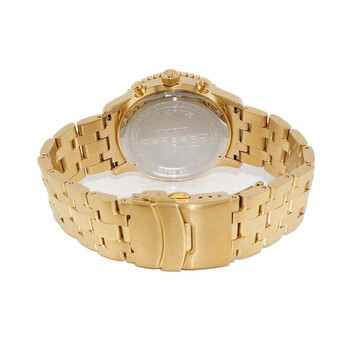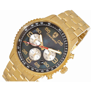Yellow gold-tone stainless steel case and bracelet. Fixed yellow gold-tone stainless steel bezel. Black dial with yellow gold-tone hands and Arabic numeral & index hour markers. Minute markers around the outer rim. Dial Type: Analog. Luminescent hands. Date display between 4 and 5 o'clock position. Chronograph - sub-dials displaying: 24 hour. Epson VR32 quartz movement. Scratch resistant mineral crystal. Pull / push crown. Solid case back. Round case shape, case size: 46 mm, case thickness: 12.75 mm. Band width: 24 mm, band length: 7.25 inches. Fold over with double push button release clasp. Water resistant at 100 meters / 330 feet. Functions: chronograph, date, hour, minute, second. Additional Info: mother of pearl dial. Aureum-mb Series. Casual watch style. Watch label: Chronograph, Japan Mov't. Torino Carrero Aureum-Mb Chronograph Tachymeter Black Dial Men's Watch C1G7022-BK.