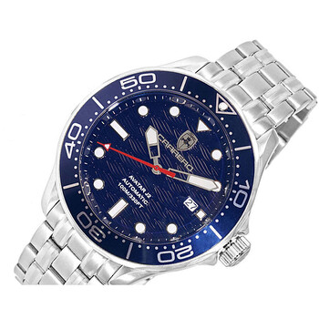 Torino Carrero Men's Avatar Automatic NH35 - 24 JEWELS, Blue Date Dial, Silver tone. Silver-tone stainless steel case and bracelet. Uni-directional rotating blue stainless steel bezel. Blue dial with silver-tone hands and Arabic numeral & index hour markers. Minute markers around the outer rim. Dial Type: Analog. Luminescent hands and markers. Date display at the 3 o'clock position. TMI Caliber NH35 Automatic movement, containing 24 Jewels, bitting at 21600 vph, and has a power reserve of approximately 41 hours. Scratch resistant mineral crystal. Screw down crown. Solid case back. Round case shape, case size: 44.5 mm, case thickness: 15 mm. Band width: 22 mm, band length: 7.25 inches. Deployment with push button release clasp. Water resistant at 100 meters / 330 feet. Functions: date, hour, minute, second. Avatar Series. Casual watch style. Watch label: Japan Movt. Torino Carrero Avatar Automatic Blue Dial Men's Watch C1S6161BUJ.
