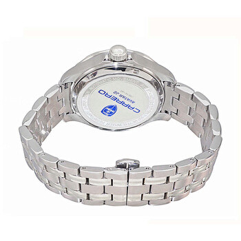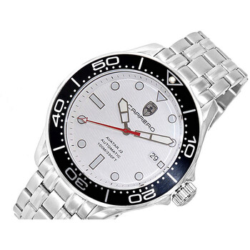 Torino Carrero Men's Avatar Automatic NH35 - 24 JEWELS, White Date Dial, Silver tone. Silver-tone stainless steel case and bracelet. Uni-directional rotating black stainless steel bezel. White dial with silver-tone hands and Arabic numeral & index hour markers. Minute markers around the outer rim. Dial Type: Analog. Luminescent hands and markers. Date display at the 3 o'clock position. TMI Caliber NH35 Automatic movement, containing 24 Jewels, bitting at 21600 vph, and has a power reserve of approximately 41 hours. Scratch resistant mineral crystal. Screw down crown. Solid case back. Round case shape, case size: 44.5 mm, case thickness: 15 mm. Band width: 22 mm, band length: 7.25 inches. Deployment with push button release clasp. Water resistant at 100 meters / 330 feet. Functions: date, hour, minute, second. Avatar Series. Casual watch style. Watch label: Japan Movt. Torino Carrero Avatar Automatic White Dial Men's Watch C1S6161WTJ.