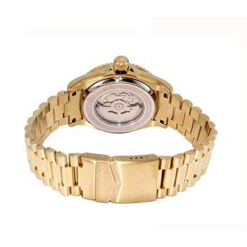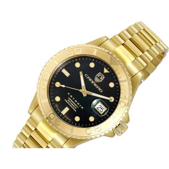 Torino Carrero Men's Avatar Automatic NH35 - 21 JEWELS, Mother of Pearl Black DateDial,Gold tone. Yellow gold-tone stainless steel case and bracelet. Uni-directional rotating yellow gold-tone stainless steel bezel. Black dial with yellow gold-tone hands and index hour markers. Minute markers around the outer rim. Dial Type: Analog. Luminescent hands and markers. Date display at the 3 o'clock position. TMI Caliber NH35 Automatic movement, containing 24 Jewels, bitting at 21600 vph, and has a power reserve of approximately 41 hours. Scratch resistant mineral crystal. Screw down crown. Transparent case back. Round case shape, case size: 44 mm, case thickness: 15 mm. Band width: 21.5 mm, band length: 8.25 inches. Deployment with push button release clasp. Water resistant at 100 meters / 330 feet. Functions: date, hour, minute, second. Catania Series. Casual watch style. Watch label: Japan Movt. Torino Carrero Catania Automatic Black Dial Men's Watch C1G266BK J.