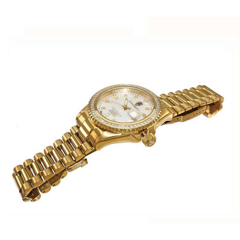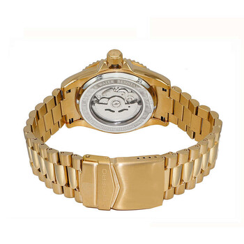 Torino Carrero Men's Catania Sapphire Automatic NH35 - 24 JEWELS,w/ Guniune Sapphire Gem Stone (69 pcs) Mother of Pearl White Dial, Gold tone. Yellow gold-tone stainless steel case and bracelet. Uni-directional rotating yellow gold-tone stainless steel bezel. Black dial with yellow gold-tone hands and index hour markers. Minute markers around the outer rim. Dial Type: Analog. Luminescent hands and markers. Date display at the 3 o'clock position. TMI Caliber NH35 Automatic movement, containing 24 Jewels, bitting at 21600 vph, and has a power reserve of approximately 41 hours. Scratch resistant mineral crystal. Screw down crown. Transparent case back. Round case shape, case size: 44 mm, case thickness: 15 mm. Band width: 20 mm, band length: 8.25 inches. Deployment with push button release clasp. Water resistant at 200 meters / 660 feet. Functions: date, hour, minute, second. Catania Series. Casual watch style. Watch label: Japan Movt. Torino Carrero Catania Automatic Black Dial Men's Watch C1G787WTJ.