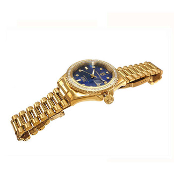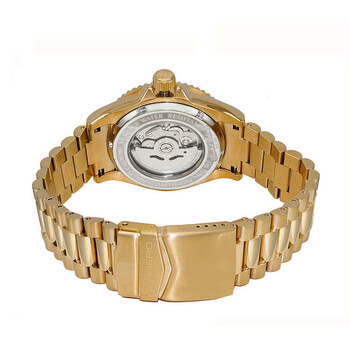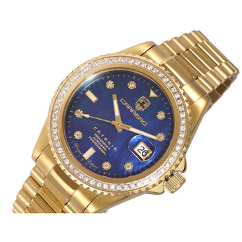 Torino Carrero Men's Catania Sapphire Automatic NH35 - 24 JEWELS,w/ Guniune Sapphire Gem Stone (69 pcs) Mother of Pearl Blue Dial, Gold tone. Yellow gold-tone stainless steel case and bracelet. Uni-directional rotating yellow gold-tone stainless steel bezel. Blue dial with yellow gold-tone hands and index hour markers. Minute markers around the outer rim. Dial Type: Analog. Luminescent hands and markers. Date display at the 3 o'clock position. TMI Caliber NH35 Automatic movement, containing 24 Jewels, bitting at 21600 vph, and has a power reserve of approximately 41 hours. Scratch resistant mineral crystal. Screw down crown. Transparent case back. Round case shape, case size: 44 mm, case thickness: 15 mm. Band width: 20 mm, band length: 8.25 inches. Deployment with push button release clasp. Water resistant at 200 meters / 660 feet. Functions: date, hour, minute, second. Catania Series. Casual watch style. Watch label: Japan Movt. Torino Carrero Catania Automatic Blue Dial Men's Watch C1G787BUJ.