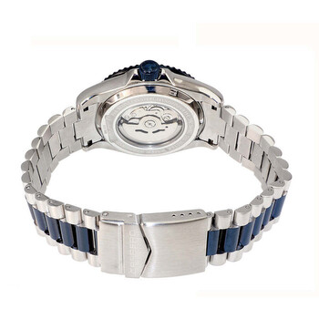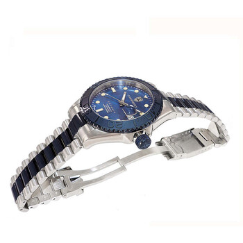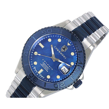 Torino Carrero Men's Avatar Automatic NH35 - 21 JEWELS, Mother of Pearl Blue DateDial, 2-tone Blue-IP tone. Silver-tone stainless steel case with a two-tone (silver-tone and blue) stainless steel bracelet. Uni-directional rotating blue stainless steel bezel. Blue dial with silver-tone hands and index hour markers. Minute markers around the outer rim. Dial Type: Analog. Luminescent hands and markers. Date display at the 3 o'clock position. TMI Caliber NH35 Automatic movement, containing 24 Jewels, bitting at 21600 vph, and has a power reserve of approximately 41 hours. Scratch resistant mineral crystal. Screw down crown. Transparent case back. Round case shape, case size: 44 mm, case thickness: 15 mm. Band width: 21.5 mm, band length: 8.25 inches. Deployment with push button release clasp. Water resistant at 100 meters / 330 feet. Functions: date, hour, minute, second. Catania Series. Casual watch style. Watch label: Japan Movt. Torino Carrero Catania Automatic Blue Dial Men's Watch C2BU266BUJ.