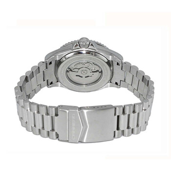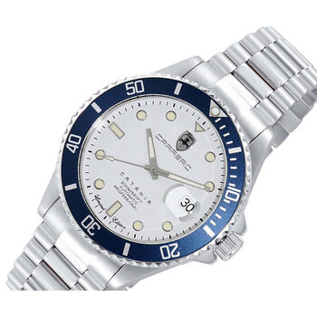 Torino Carrero Men's Catania-PD Automatic NH35 - 21 JEWELS, Silver Date Dial Blue Bezel, Silver tone. Silver-tone stainless steel case and bracelet. Uni-directional rotating blue aluminum bezel. Silver-tone dial with silver-tone hands and index hour markers. Minute markers around the outer rim. Dial Type: Analog. Luminescent hands and markers. Date display at the 3 o'clock position. TMI Caliber NH35 Automatic movement, containing 24 Jewels, bitting at 21600 vph, and has a power reserve of approximately 41 hours. Scratch resistant mineral crystal. Screw down crown. Transparent case back. Round case shape, case size: 44 mm, case thickness: 15 mm. Band width: 21 mm, band length: 8.25 inches. Deployment with push button release clasp. Water resistant at 200 meters / 660 feet. Functions: date, hour, minute, second. Catania Series. Casual watch style. Watch label: Japan Movt. Torino Carrero Catania Automatic Silver Dial Men's Watch C1S888SVJ.