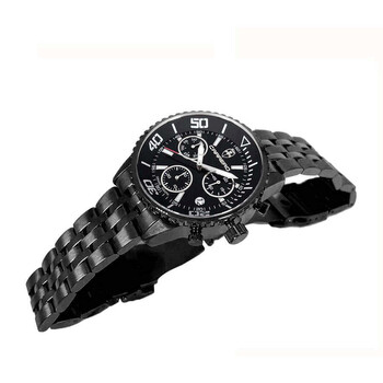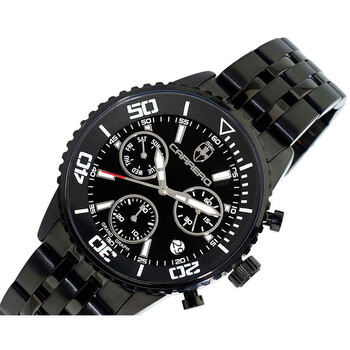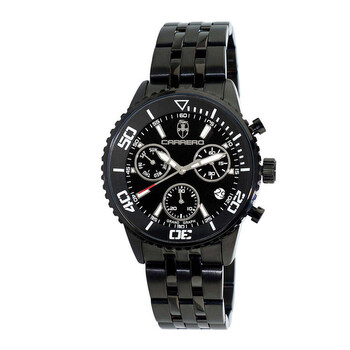 Torino Carrero Men's Prime Swiss Chronograph ( RONDA Z-60), Black Date Dial and Bezel, IP-Black tone. Black stainless steel case and bracelet. Fixed black stainless steel bezel. Black dial with silver-tone hands and Roman numeral & index hour markers. Minute markers around the outer rim. Dial Type: Analog. Luminescent hands and markers. Day / date. Three sub-dials displaying: day, 60 second and 30 minute. Ronda Caliber Z60 quartz movement. Scratch resistant mineral crystal. Screw down crown. Solid case back. Round case shape, case size: 44 mm, case thickness: 13 mm. Band width: 22 mm, band length: 8.5 inches. Deployment with push button release clasp. Water resistant at 100 meters / 330 feet. Functions: chronograph, date, day, hour, minute, small second. Additional Info: 30 second. Grandgrap Series. Casual watch style. Watch label: Swiss Made, Chronograph Movement. Torino Carrero GrandGrap Chronograph Quartz Black Dial Men's Watch C1B4343BKJ.