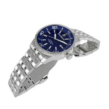 Torino Carrero Men's GrandMaster Automatic NH35 - 21 JEWELS, Blue Date Dial, Silver tone. Silver-tone stainless steel case and bracelet. Fixed blue stainless steel bezel. Blue dial with silver-tone hands and Arabic numeral & index hour markers. Minute markers around the outer rim. Dial Type: Analog. Luminescent hands and markers. Date display at the 3 o'clock position. TMI Caliber NH35 Automatic movement, containing 24 Jewels, bitting at 21600 vph, and has a power reserve of approximately 41 hours. Scratch resistant mineral crystal. Screw down crown. Solid case back. Round case shape, case size: 44 mm, case thickness: 13 mm. Band width: 22 mm, band length: 8.5 inches. Deployment with push button release clasp. Water resistant at 100 meters / 330 feet. Functions: date, hour, minute, second. Grandmaster Series. Casual watch style. Watch label: Japan Movt. Torino Carrero GrandMaster Automatic Blue Dial Men's Watch C1S4345BUJ.