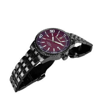 Torino Carrero Men's GrandMaster Automatic NH35 - 21 JEWELS, Maroon Date Dial, IP-Black tone. Black stainless steel case and bracelet. Fixed black stainless steel bezel. Brown dial with black hands and Arabic numeral & index hour markers. Minute markers around the outer rim. Dial Type: Analog. Luminescent hands and markers. Date display at the 3 o'clock position. TMI Caliber NH35 Automatic movement, containing 24 Jewels, bitting at 21600 vph, and has a power reserve of approximately 41 hours. Scratch resistant mineral crystal. Screw down crown. Solid case back. Round case shape, case size: 44 mm, case thickness: 13 mm. Band width: 22 mm, band length: 8.5 inches. Deployment with push button release clasp. Water resistant at 100 meters / 330 feet. Functions: date, hour, minute, second. Grandmaster Series. Casual watch style. Watch label: Japan Movt. Torino Carrero GrandMaster Automatic Brown Dial Men's Watch C1B4345BRJ.