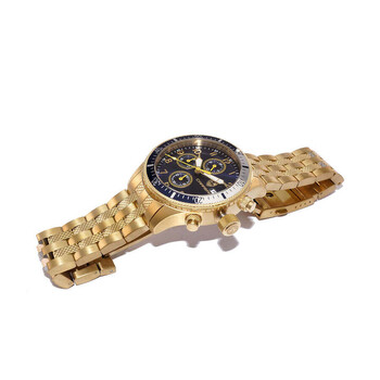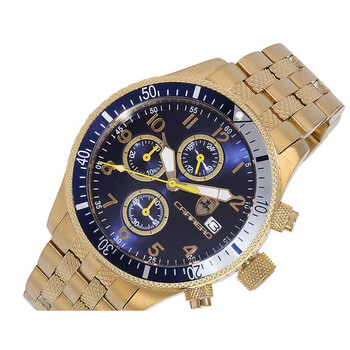 Torino Carrero Men's, Chronohraph Epson VR33 Muscle Movement, 24-hr/60-sec/30-sec counter, Blue Date Dial, Blue-Silver bezel, Gold tone Yellow gold-tone stainless steel case and bracelet. Uni-directional rotating blue aluminum bezel. Blue dial with yellow gold-tone hands and Arabic & index hour markers. Minute scale around the inner rim. Dial Type: Analog. Luminescent hands. Date display at the 3 o'clock position. Chronograph - sub-dials displaying: 24 hour. Epson VR33 Muscle Movement quartz movement. Scratch resistant mineral crystal. Screw down crown. Solid case back. Round case shape, case size: 44 mm, case thickness: 14 mm. Band width: 22 mm, band length: 8.25 inches. Deployment with push button release clasp. Water resistant at 100 meters / 330 feet. Functions: chronograph, date, hour, minute, second. Lasergraph Series. Casual watch style. Watch label: Chronograph Movement , Japan Made. Torino Carrero LaserGraph Chronograph Quartz Blue Dial Men's Watch CG17733BUSVJ.
