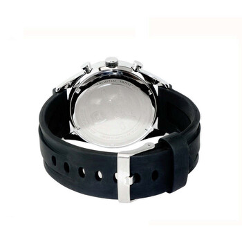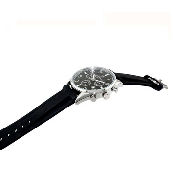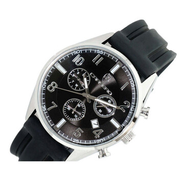 Torino Carrero Men's Prime Swiss Chronograph ( RONDA Z-60), Black Date Dial Silver tone Black Silicon-band. Silver-tone stainless steel case with a black silicone strap. Fixed silver-tone stainless steel bezel. Black dial with silver-tone hands and Arabic numeral & index hour markers. Minute scale around the inner rim. Dial Type: Analog. Luminescent hands and markers. Day / date. Three sub-dials displaying: day, 60 second and 30 minute. Ronda Caliber Z60 quartz movement. Scratch resistant mineral crystal. Pull / push crown. Solid case back. Round case shape, case size: 46 mm, case thickness: 12 mm. Band width: 24 mm, band length: 7.5 inches. Buckle clasp. Water resistant at 100 meters / 330 feet. Functions: chronograph, date, day, hour, minute, small second. Additional Info: 30 second. Prime Series. Casual watch style. Watch label: Swiss Made, Chronograph Movement. Torino Carrero Prime Chronograph Quartz Black Dial Men's Watch C1S5275BK-RBJ.