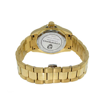 Torino Carrero Men's Catania Subaquatic, Swiss Made Ronda - 515.24D, 24-hr GMT, Ceramic rotating Bezel, Black date dial, Gold tone. Yellow gold-tone stainless steel case and bracelet. Uni-directional rotating black ceramic bezel. Black dial with yellow gold-tone hands and index hour markers. Minute markers around the outer rim. Dial Type: Analog. Luminescent hands and markers. Date display at the 3 o'clock position. Ronda Caliber 515.24D quartz movement. Scratch resistant mineral crystal. Screw down crown. Solid case back. Round case shape, case size: 42 mm, case thickness: 12 mm. Band width: 22 mm, band length: 8 inches. Deployment with push button release clasp. Water resistant at 100 meters / 330 feet. Functions: date, GMT, second time zone, hour, minute, second. Subaquatic Series. Casual watch style. Watch label: Swiss Made Quartz Movement. Torino Carrero Subaquatic GMT Quartz Black Dial Men's Watch C1G10BK-BKBKJ.