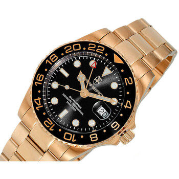 Torino Carrero Men's Catania Subaquatic, Swiss Made Ronda - 515.24D, 24-hr GMT, Black date dial and Ceramic rotating Bezel, Rose tone. Rose gold-tone stainless steel case and bracelet. Uni-directional rotating black ceramic bezel. Black dial with rose gold-tone hands and index hour markers. Minute markers around the outer rim. Dial Type: Analog. Luminescent hands and markers. Date display at the 3 o'clock position. Ronda Caliber 515.24D quartz movement. Scratch resistant mineral crystal. Screw down crown. Solid case back. Round case shape, case size: 42 mm, case thickness: 12 mm. Band width: 22 mm, band length: 8 inches. Deployment with push button release clasp. Water resistant at 100 meters / 330 feet. Functions: date, GMT, second time zone, hour, minute, second. Subaquatic Series. Casual watch style. Watch label: Swiss Made Quartz Movement. Torino Carrero Subaquatic GMT Quartz Black Dial Men's Watch C1R10BK-BKJ.