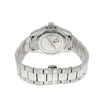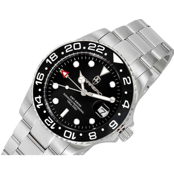 Torino Carrero Men's Catania Subaquatic, Swiss Made Ronda - 515.24D, 24-hr GMT, Black date dial and Ceramic rotating Bezel, Silver tone. Silver-tone stainless steel case and bracelet. Uni-directional rotating black ceramic bezel. Black dial with silver-tone hands and index hour markers. Minute markers around the outer rim. Dial Type: Analog. Luminescent hands and markers. Date display at the 3 o'clock position. Ronda Caliber 515.24D quartz movement. Scratch resistant mineral crystal. Screw down crown. Solid case back. Round case shape, case size: 42 mm, case thickness: 12 mm. Band width: 22 mm, band length: 8 inches. Deployment with push button release clasp. Water resistant at 100 meters / 330 feet. Functions: date, GMT, second time zone, hour, minute, second. Subaquatic Series. Casual watch style. Watch label: Swiss Made Quartz Movement. Torino Carrero Subaquatic GMT Quartz Black Dial Men's Watch C1S10BK-BKBKJ.