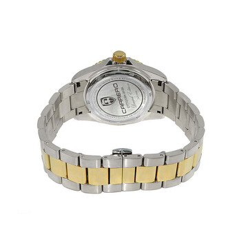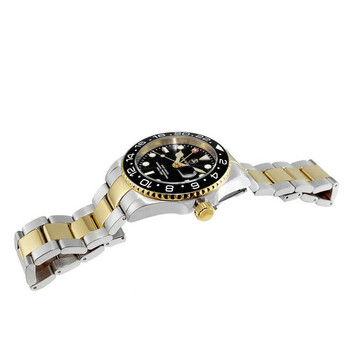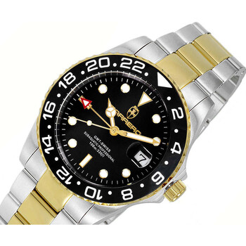 Torino Carrero Men's Catania Subaquatic, Swiss Made Ronda - 515.24D, 24-hr GMT, Black date dial and Ceramic rotating Bezel, 2-tone Gold. Silver-tone stainless steel case with a two-tone (silver-tone and yellow gold-tone) stainless steel bracelet. Uni-directional rotating black ceramic bezel. Black dial with yellow gold-tone hands and index hour markers. Minute markers around the outer rim. Dial Type: Analog. Luminescent hands and markers. Date display at the 3 o'clock position. Ronda Caliber 515.24D quartz movement. Scratch resistant mineral crystal. Screw down crown. Solid case back. Round case shape, case size: 42 mm, case thickness: 12 mm. Band width: 22 mm, band length: 8 inches. Deployment with push button release clasp. Water resistant at 100 meters / 330 feet. Functions: date, GMT, second time zone, hour, minute, second. Subaquatic Series. Casual watch style. Watch label: Swiss Made Quartz Movement. Torino Carrero Subaquatic GMT Quartz Black Dial Men's Watch C1TTG10BK-BKJ.