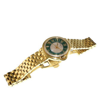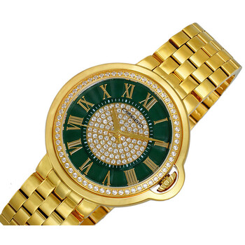 Torino Carrero Ladies Toulon, Swiss Ronda - 763, Setting Stone (164 pcs), Green dial Goldtone Yellow gold-tone stainless steel case and bracelet. Fixed yellow gold-tone stainless steel bezel. Green dial with yellow gold-tone hands and Roman numeral hour markers. Minute markers around the outer rim. Dial Type: Analog. Luminescent hands. Ronda Caliber 763 quartz movement. Scratch resistant mineral crystal. Pull / push crown. Solid case back. Round case shape, case size: 37.5 mm, case thickness: 10 mm. Band width: 18.25 mm, band length: 7 inches. Deployment with push button release clasp. Water resistant at 30 meters / 100 feet. Functions: hour, minute, second. Toulon Series. Casual watch style. Watch label: Swiss Quartz Movement. Torino Carrero Toulon Quartz Green Dial Ladies Watch CL1G04GNJ.