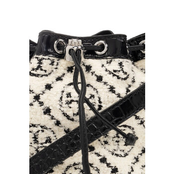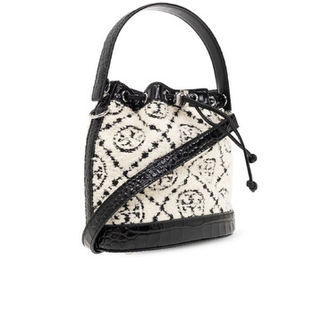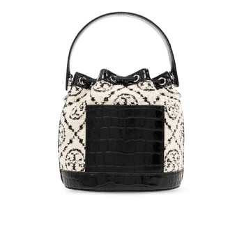 Tory Burch Ladies Bucket Bag. SKU: 152385-001. Color: Black. Size: H: 8.3" x L: 8.3" x D: 4.7". Tory Burch Boucle Monogram Drawstring Bucket Bag. This bucket bag features a microfiber lining with a suede-like finish, a drawstring closure, and a top handle with a 6.1" (15.5cm) drop. It also includes an adjustable, removable crossbody strap with a 21.7" (55cm) drop, one exterior back slit pocket, one interior pocket, and a croc-embossed leather base with protective metal feet. Material: Boucle monogram and croc embossed leather; napa leather trim.