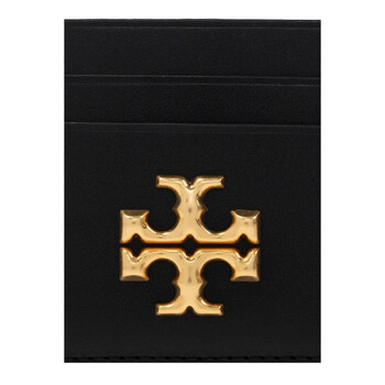 Tory Burch Ladies Card Case. SKU: 86346-001. Color: Black. Size: H: 3" × L: 3.9". Tory Burch Eleanor Logo-Plaque Card Case. This card case features brass hardware, 4 exterior card slots, and 1 center pocket. 100% Calf Leather. Made in China.