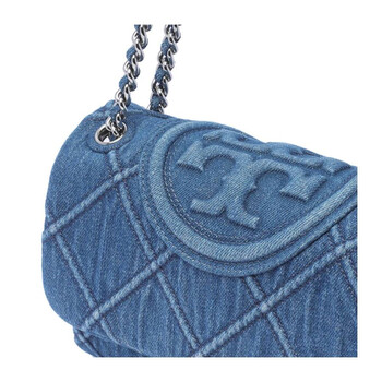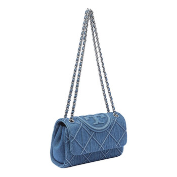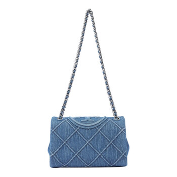 Tory Burch Ladies Shoulder Bag. SKU: 154739-426. Color: Denim. Size: H: 5.7" x L: 8.7" x D: 5.7". Tory Burch Flemimg Soft Denim Shoulder Bag. This shoulder bag features a flap with a magnetic snap closure, a convertible chain and denim interwoven strap with a 22.2" (56.5cm) drop, one interior back wall zip pocket, and one interior front wall slit pocket. It also comes with a dust bag. 100% Cotton, 100% Nappa Leather, 100% Denim. Made in China.