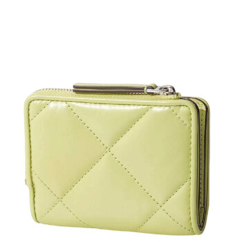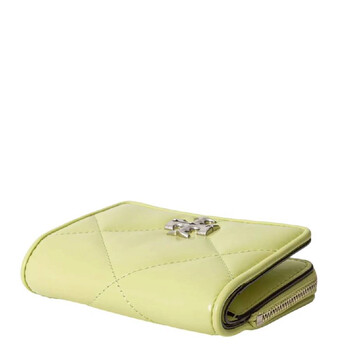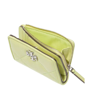 Tory Burch Ladies Wallets. SKU: 154990-300. Color: Pear. Size: H: 3.5" × L: 4.7". Tory Burch Kira Diamond Quilt Leather Wallet. This wallet is made of calf leather with diamond quilting, featuring a press-stud fastening, a signature Double T plaque on the front, and a rear zip-fastening pocket. Inside, it has a note compartment, six card slots, and an internal logo stamp, all designed in a bi-fold style. Material: Nappa Leather 100%.