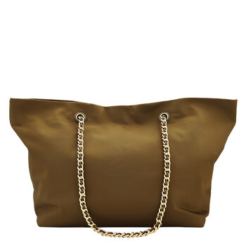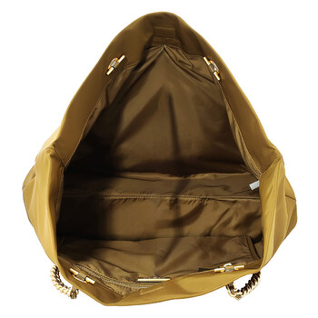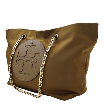 Tory Burch Ladies Tote. Ella series. SKU: 152313-201. Color: Camel. Size: Height: 11.4" (29cm) x length: 12.6" (32cm) x depth: 6.3" (16cm). Tory Burch Ladies Camel Ella Chain Tote. The Ella Chain Tote is softly deconstructed in featherweight recycled nylon and features a magnetic snap closure, chain and leather interwoven shoulder straps with 10" (25.5cm) drop attached to leather wrapped toggles, 1 hidden exterior pocket on logo patch, 1 interior back wall zipper pocket, faux leather trim and finished with a tonal double T logo on the snap pocket on the front.