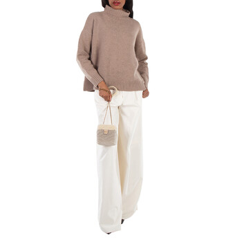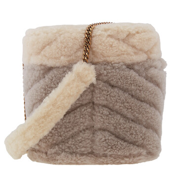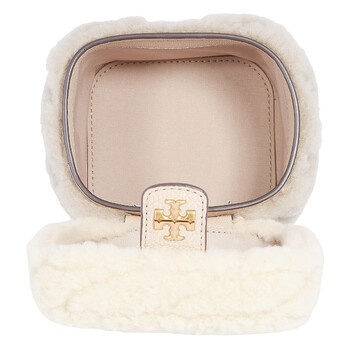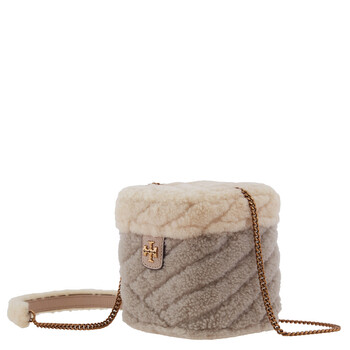 Tory Burch Ladies Crossbody. SKU: 152551-020. Color: Grey. Size: 12.5 x 13 x 11 cm. Tory Burch Mini Kira Vanitycase Crossbody Bag. This bag is a chic and cozy accessory, crafted from plush shearling with a quilted design. It has a gold-tone chain strap with a shearling-padded section for comfort. The signature Tory Burch logo embellishes the front flap closure.