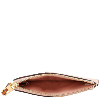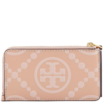 Tory Burch Ladies Card Case. SKU: 158862-250. Color: Orange. Size: H: 2.8" x L: 5.2". Tory Burch T Monogram Zip Card Case. The card Case, crafted from embossed leather with a signature pattern and leather trim, features a zipper closure, five exterior card slots, a coin pouch, and multiple pockets for organized storage, combining timeless style with functionality. 100% Leather.