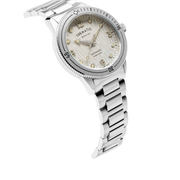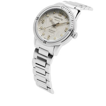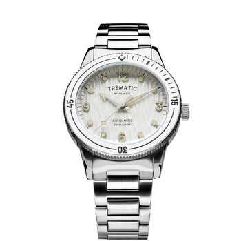 Silver-tone stainless steel case and bracelet. Silver-tone tungsten bezel. Silver-tone dial with silver-tone hands and Arabic numeral & index hour markers. Minute markers around the outer rim. Dial Type: Analog. Luminescent hands and markers. Sellita Caliber SW 200 Automatic movement, based upon ETA 2824-2, containing 26 Jewels, bitting at 28800 vph, and has a power reserve of approximately 38 hours. Scratch resistant sapphire crystal. Screw down crown. Solid case back. Round case shape, case size: 39 mm, case thickness: 12 mm. Band width: 20 mm. Fold over clasp with a safety release. Water resistant at 200 meters / 660 feet. Functions: hour, minute, second. Ac 14 Series. Luxury watch style. Watch label: Swiss Made. Trematic Ac 14 Automatic Silver Dial Men's Watch 141313.