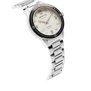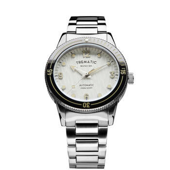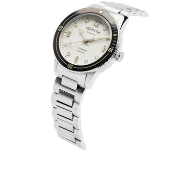 Silver-tone stainless steel case and bracelet. Black tungsten bezel. White dial with silver-tone hands and Arabic numeral & index hour markers. Minute markers around the outer rim. Dial Type: Analog. Luminescent hands and markers. Sellita Caliber SW 200 Automatic movement, based upon ETA 2824-2, containing 26 Jewels, bitting at 28800 vph, and has a power reserve of approximately 38 hours. Scratch resistant sapphire crystal. Screw down crown. Solid case back. Round case shape, case size: 39 mm, case thickness: 12 mm. Band width: 20 mm. Water resistant at 200 meters / 660 feet. Functions: hour, minute, second. Ac 14 Series. Luxury watch style. Watch label: Swiss Made. Trematic Ac 14 Automatic White Dial Men's Watch 141213.